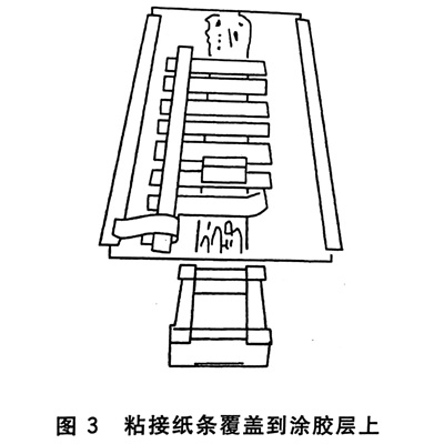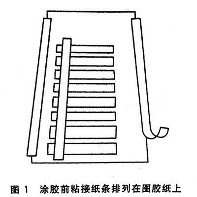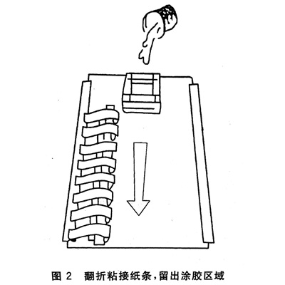 板上(如木板等),再把墊板置于操作平臺(tái)上。將粘接紙條以間距6 mm整齊排列,首條離頂端約75 mm處,用壓敏膠枯帶將這些粘接紙條粘貼到涂膠底紙上,然后如圖2翻折,露出涂膠底紙上準(zhǔn)備涂膠地方。